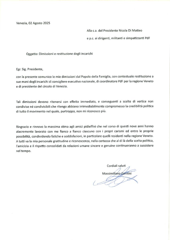 Tuttavia in data 02/08/2025 ha presentato formali dimissioni dal partito e contestuale restituzione di ogni incarico alla presidenza per i motivi di seguito esposti: